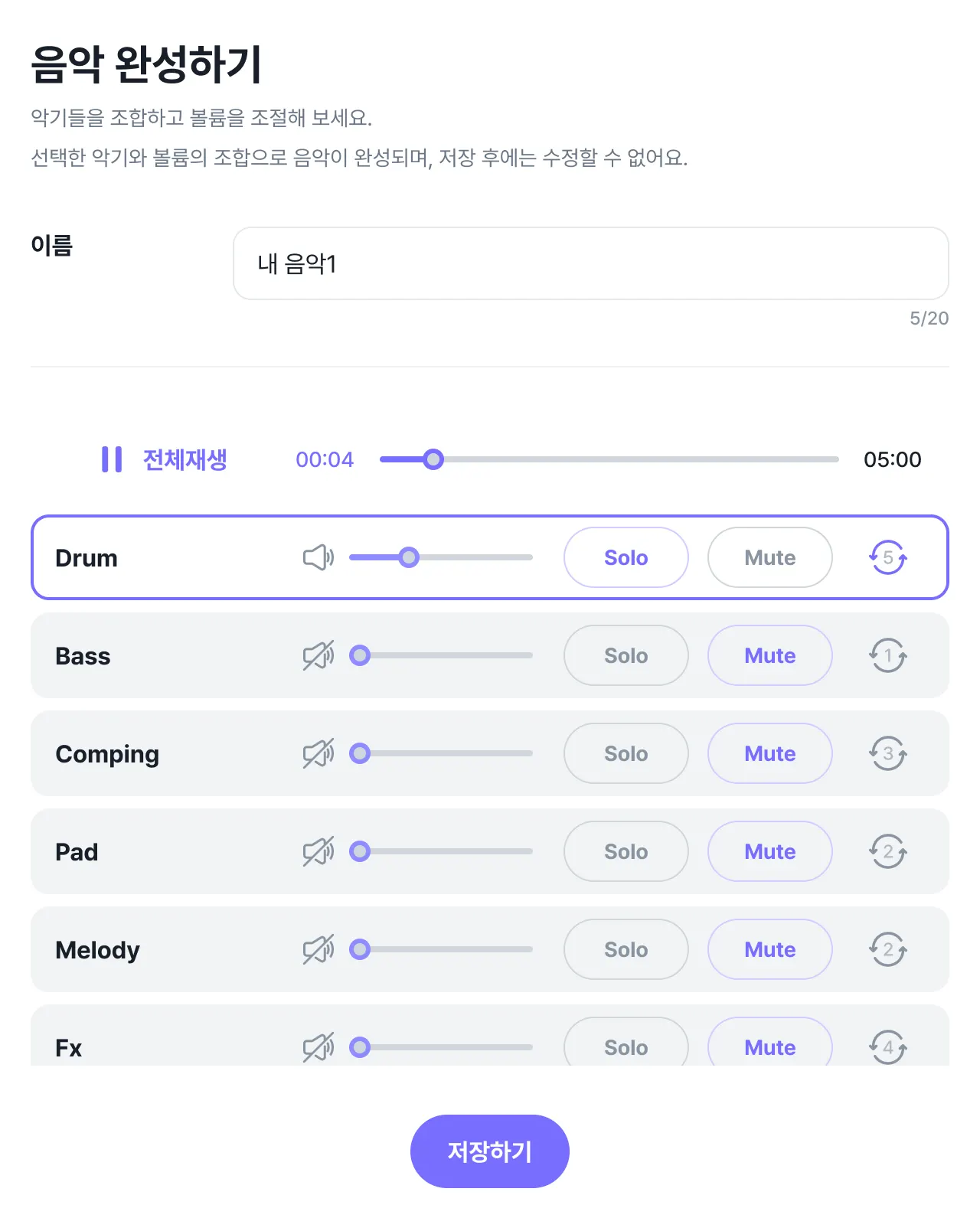 음악에서 사용하는 악기의 구성 선택 마지막으로 원하는 악기의 볼륨을 조정하고 삭제, 재생성하는