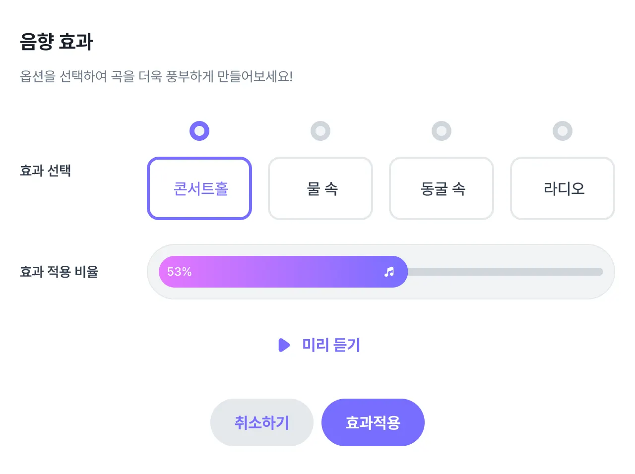 ‘완성하기’ 기능을 통해 생성되는 음악의 만족도를 높힐 수 있어요.