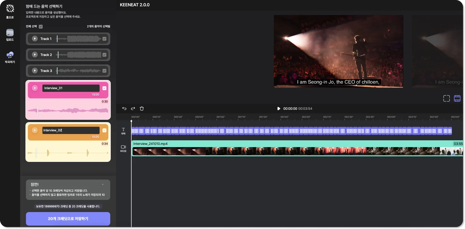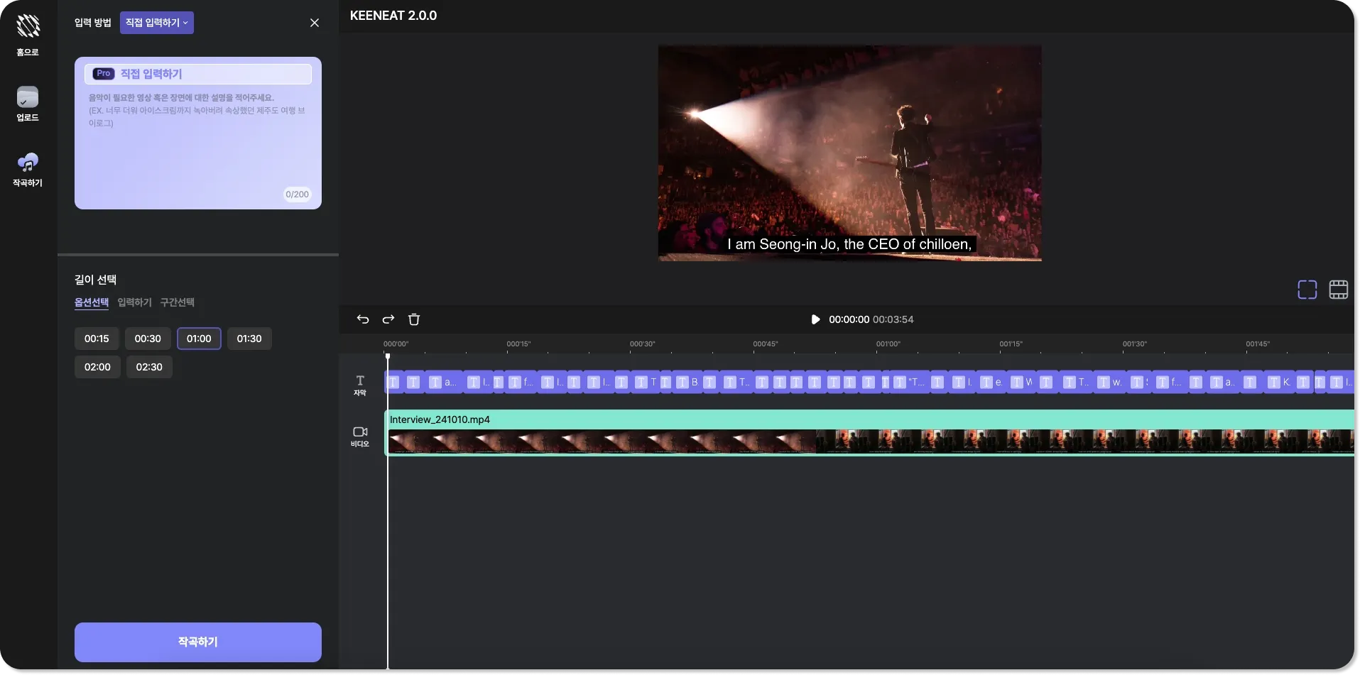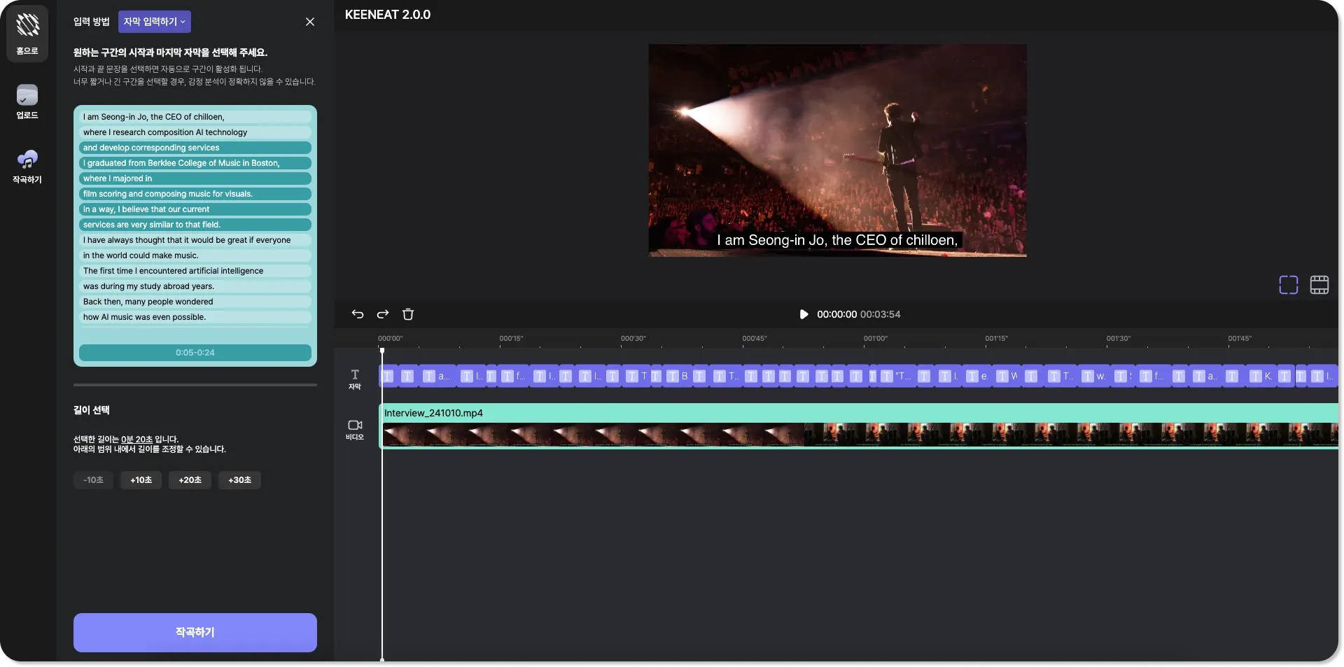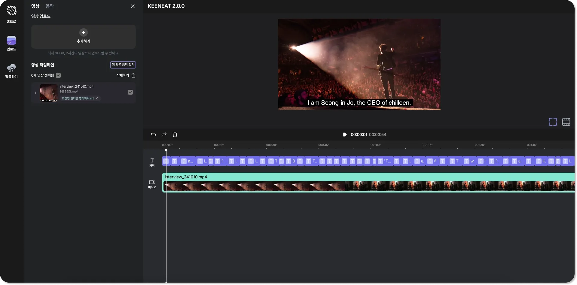 업데이트를 통해, 한 프로젝트에 복수의 영상을 업로드가 가능해졌어요. 영상 타임라인이 추가되어 더욱 수월하게 영상 맞춤 작곡이 가능해요. 그리고 컴퓨터에 가지고 있는 자막을 업로드하는 기능이 추가되었어요.