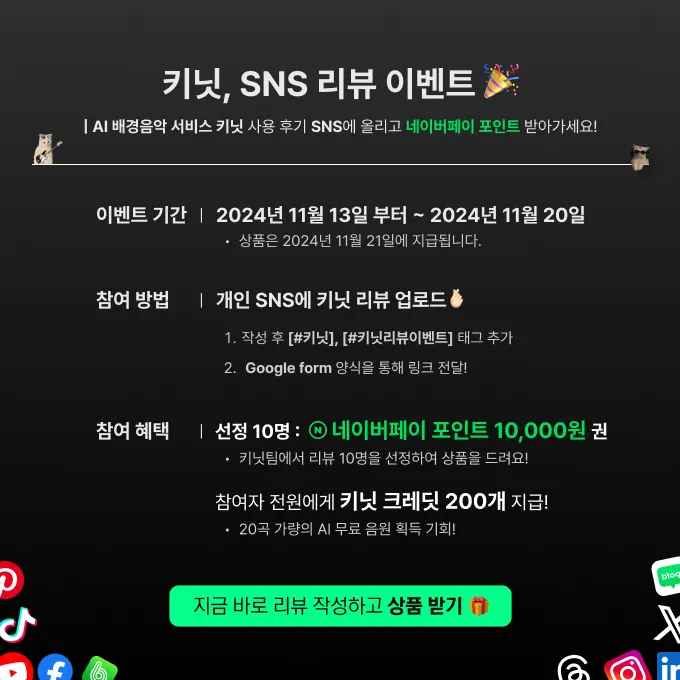참여 시, 키닛 크레딧 200개와 선정을 통해 10명에게 네이버페이 포인트 상품권을 지급 해드립니다 🫢